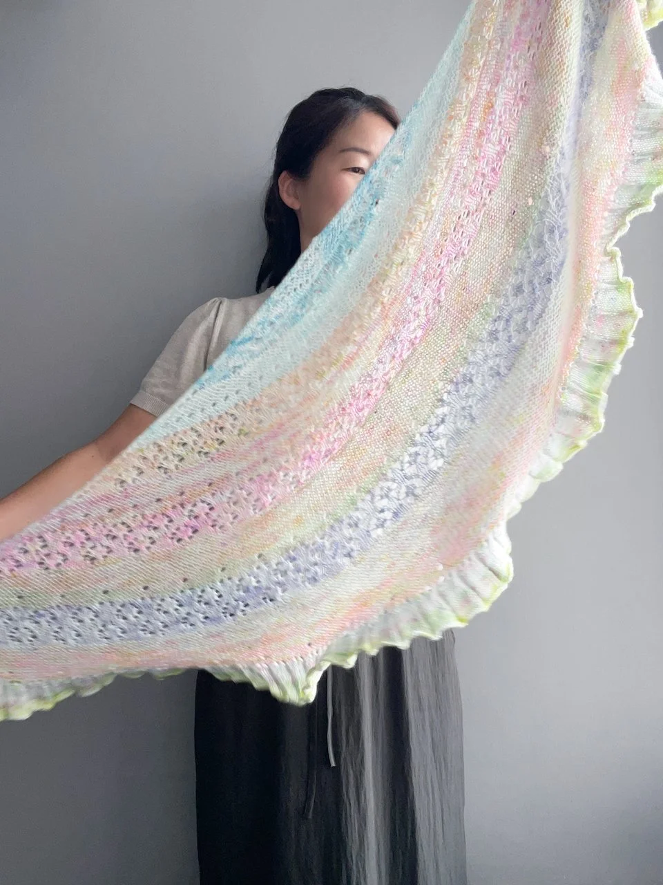 Larger shawl worked with 12 colourways (one for each “moon”).
