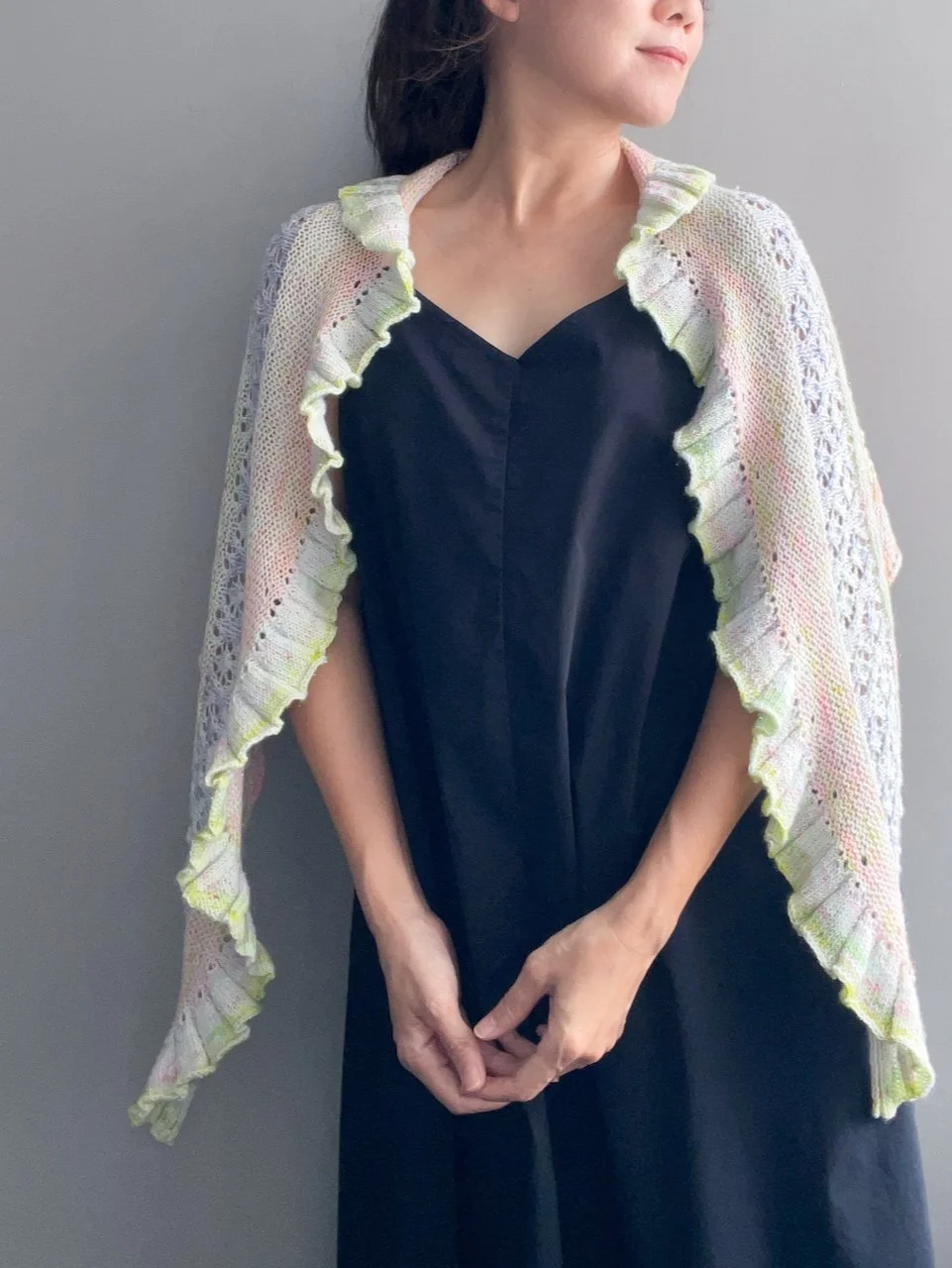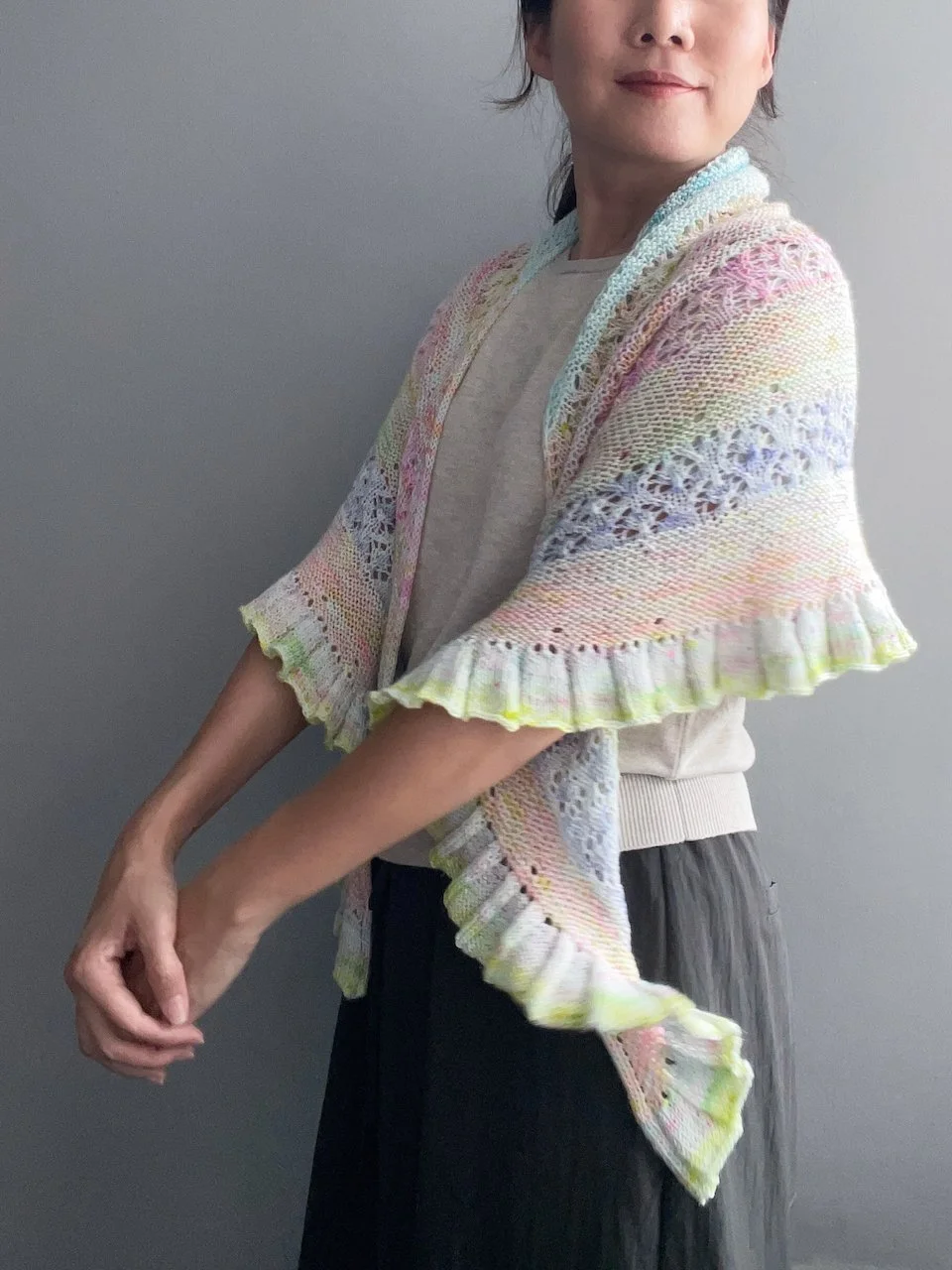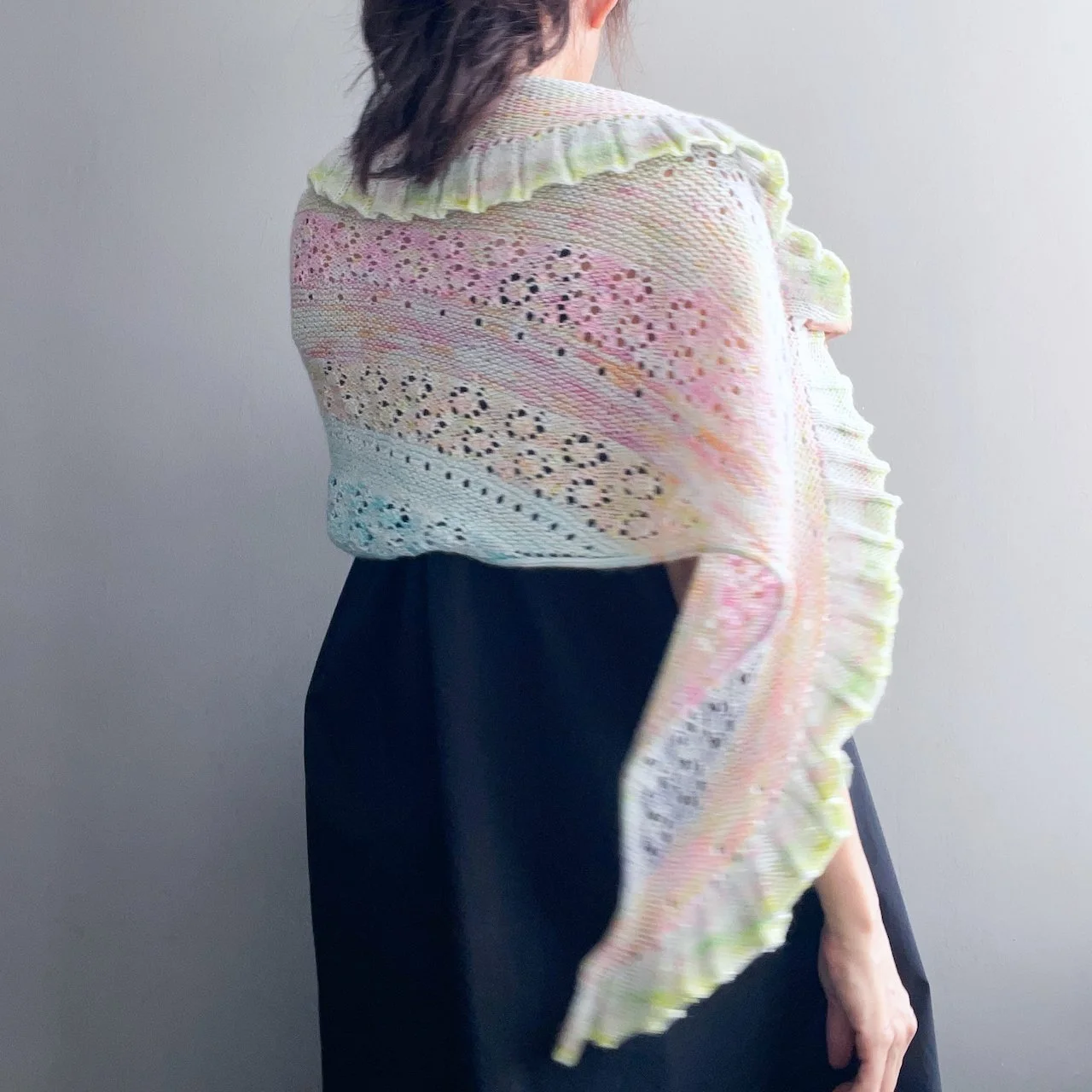 The larger shawl can be worn with the straight edge along the shoulders or reversed so the frilled edge frames the neckline. Both options drape beautifully. The mini version features a button closure that can be fastened through any yarn-over hole, offering multiple styling possibilities. Enjoy experimenting with different ways to wear and showcase your Moonlake!