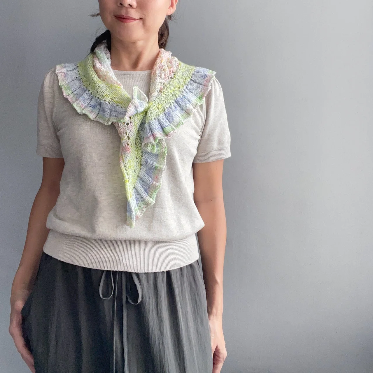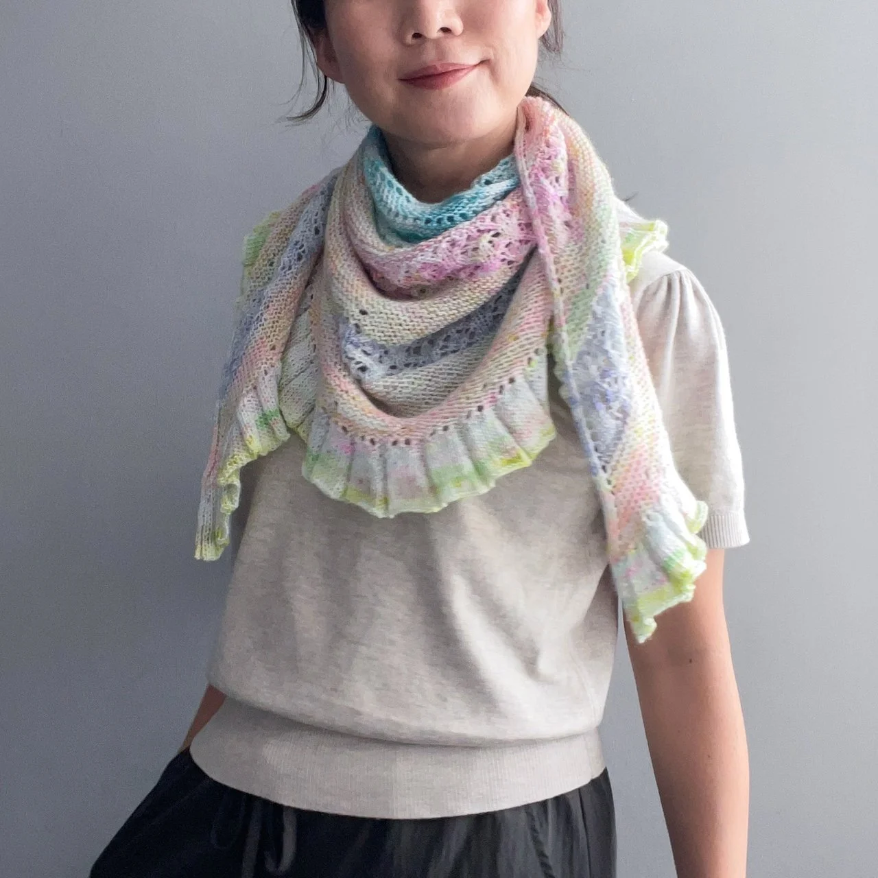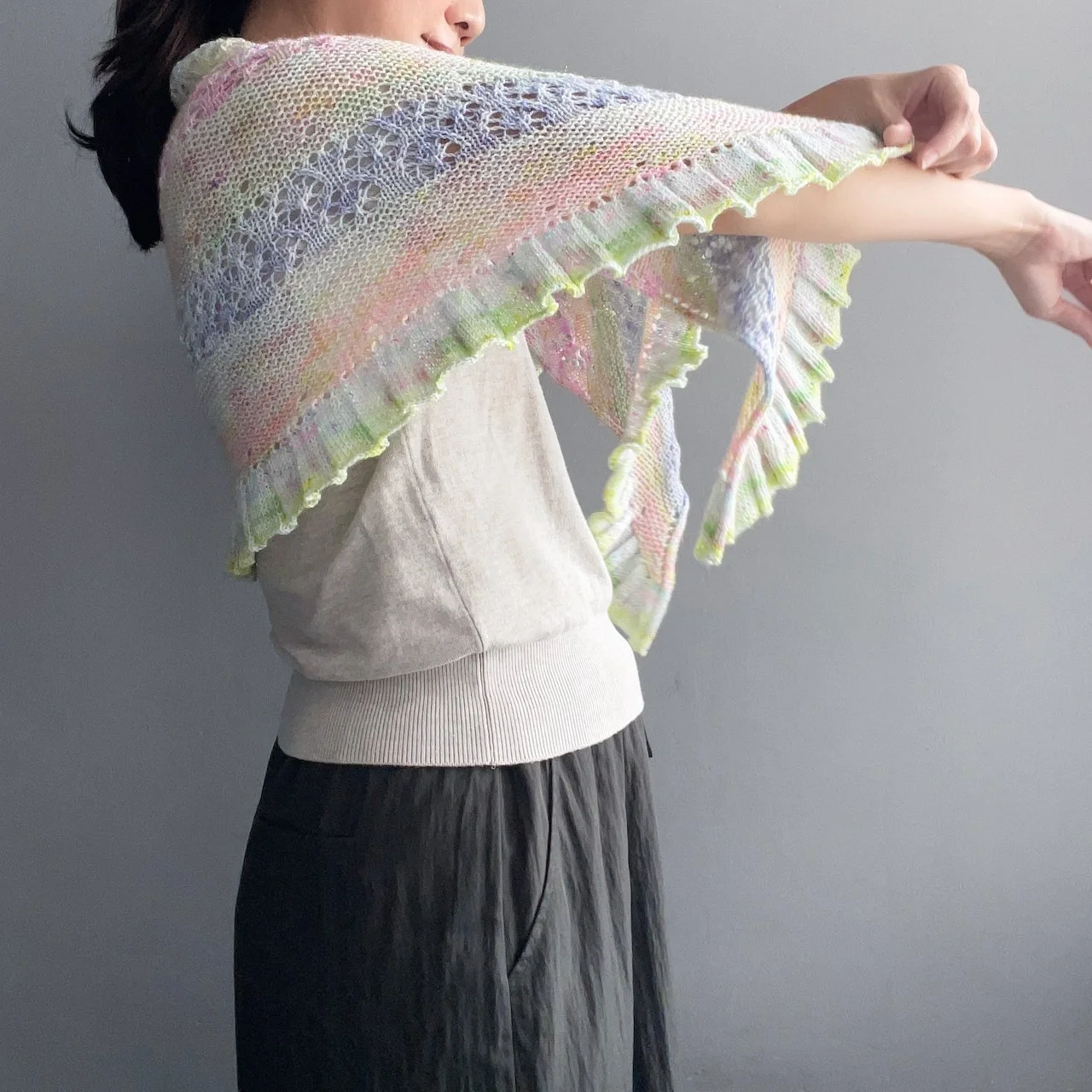The larger shawl can be worn with the straight edge along the shoulders or reversed so the frilled edge frames the neckline. Both options drape beautifully. The mini version features a button closure that can be fastened through any yarn-over hole, offering multiple styling possibilities. Enjoy experimenting with different ways to wear and showcase your Moonlake!