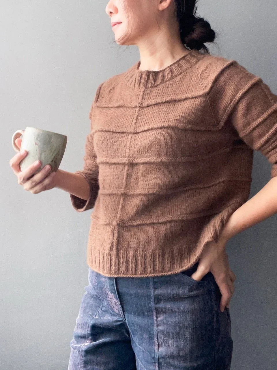 Linescape is a seamless, top-down pullover that begins at the neck. Intersecting slipped stitch lines and tuck stitch details add rhythm and texture, while short row shaping and raglan increases create a comfortable fit through the yoke.