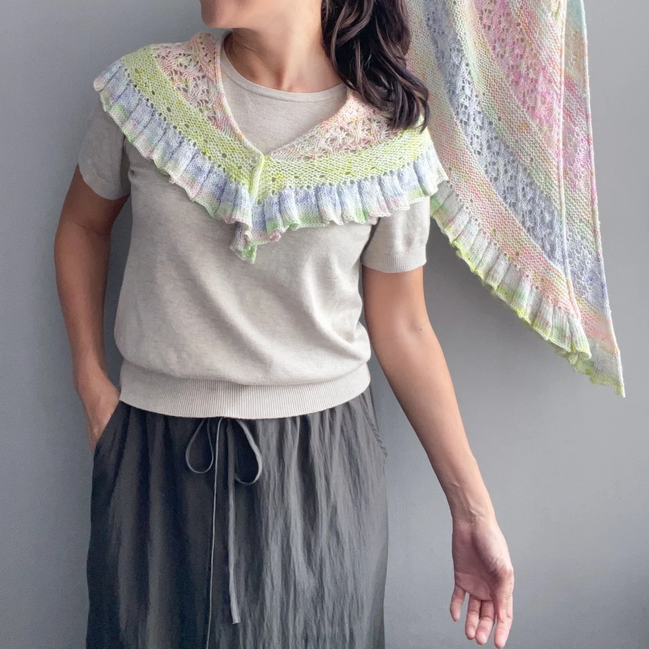 The larger shawl can be worn with the straight edge along the shoulders or reversed so the frilled edge frames the neckline. Both options drape beautifully. The mini version features a button closure that can be fastened through any yarn-over hole, offering multiple styling possibilities. Enjoy experimenting with different ways to wear and showcase your Moonlake!
