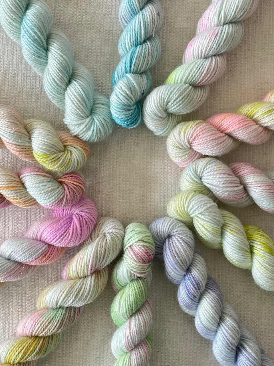 Starry mini-skeins (80 m / 87 yards per 20 g skein, 75% superwash merino, 20% nylon, 5% gold stellina)